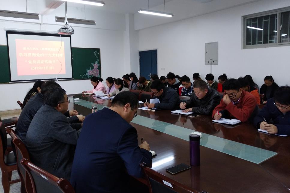 为深入学习宣传贯彻党的十九大精神,把全院师生的思想和行动统一到党的十九大精神上来,进一步推进落实学校“两学一做”学习教育的常态开展, 11月9日下午,我院党总支根据校党委安排,组织全体师生党员开展了2017年第八个“党员固定活动日”,会议由党总支书记崔兆庚同志主持。