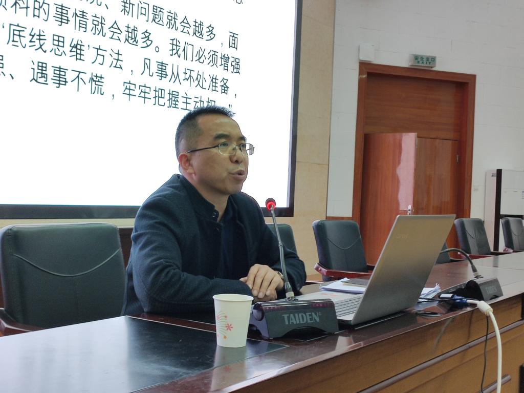 王文东副校长首先指出思维方法的重要性:方法论受限于世界观,有什么样的世界观就有什么样的方法论。接着从以下三个方面进行了具体阐述:一是从“哲学思维方法”的概念出发,阐述人们认识、改造世界时所运用的具有哲学特征的思维方法;二是从“习近平对哲学思维方法的强调和重视”展开说明,着重强调了历史思维、辩证思维、战略思维、创新思维、系统思维、底线思维六种思维方法;三是就如何提升思维行为发表观点。他指出,改革发展的任务越是繁重,各级领导干部越是需要加强学习,改善心智模式,以科学思维方法保证善做善成。