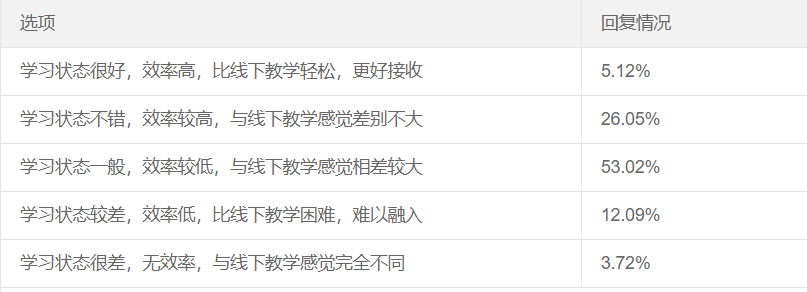 线上教学的顺利开展跟任课教师们克服了各种困难有很大关系。而且绝大部分学生刚刚接触线上学习,在网课学习过程中存在的许多问题。认为学习状态一般,效率较低,与线下教学感觉相差较大的占53.02%,学习状态不错,效率较高,与线下教学感觉差别不大的占26.05%,而认为学习状态很好,效率高,比线下教学轻松,更好接收的仅占5.12%。