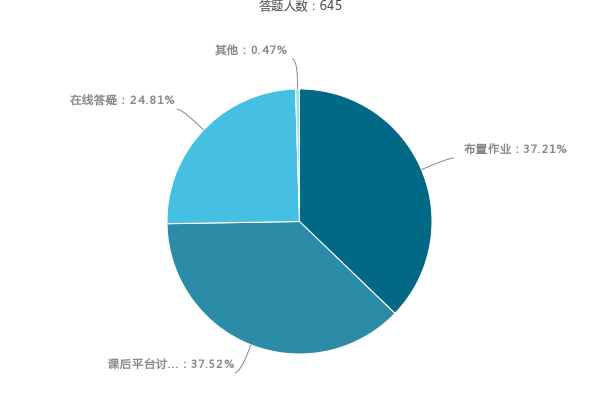 在教学的过程中,教师们与学生互动占比大的是平台讨论、布置作业、在线答疑。