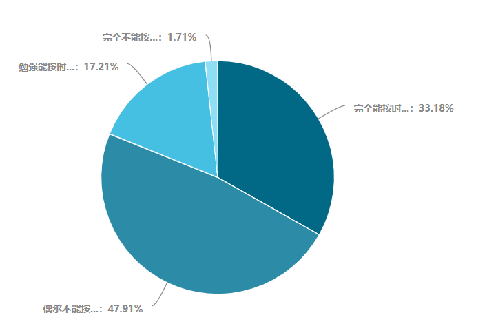 在线上教学形式能否合理规划作息时间方面,调研显示,偶尔不能按时学习的同学占47.91%,完全能按时学习的占33.18%,勉强能按时学习的占43.34%,绝大部门同学还是能够按照学院线上教学安排开展学习,特别是在目前疫情不适合开学的情况下。