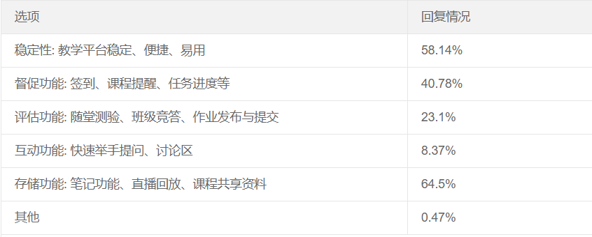 线上教学的各类功能中,同学们更看重笔记功能、直播回放、课程共享资料等,占比64.5%,教学平台稳定、便捷、易用等功能占比58.14%,签到、课程提醒、任务进度等功能占比40.78%。此外,同学们普遍对在线教学的存储功能比较看重,可以克服书本在学校,做笔记等复习资料不便的困难。
