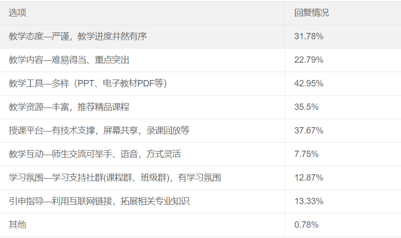 对于线上学习形式学生们更为喜欢课堂直播+互动,任课教师大部分在课前给学生提供了教学大纲、教学进度表、课程说明、以及各种教学资料。