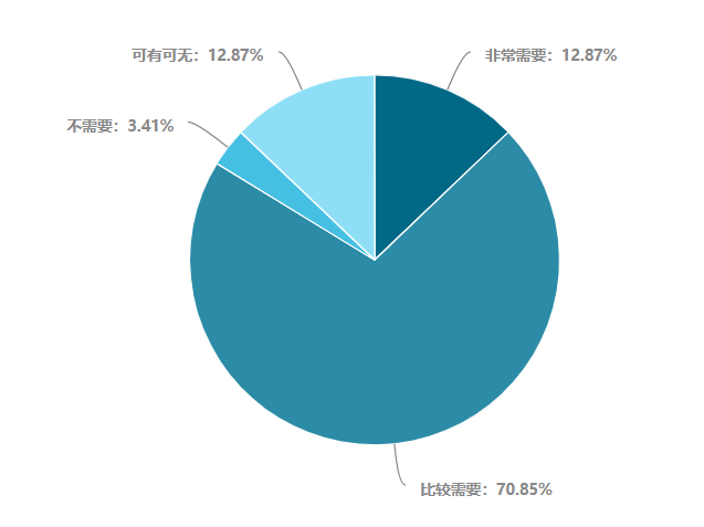 由于疫情影响,学生不能返校学习,通过问卷调查同学们对线上教学的需求,学院学生认为网课学习比较需要的占70.85%,非常需要的12.87%。线上教学在这次疫情下实际上发挥了巨大的作用,同学们还是能够认真的在线学习。