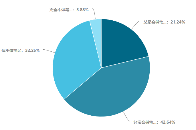 课堂学习及课后巩固复习情况调研显示,学生在进行线上学习时,经常会做笔记的占42.64%,偶尔做笔记的占32.25%,总是会做笔记的占21.24%。在家里学习过程中,多数学生也能做好学习笔记,但是网课学习后的认真复习巩固经常会看的仅占31.78%,有53.55%的学生偶尔会看。