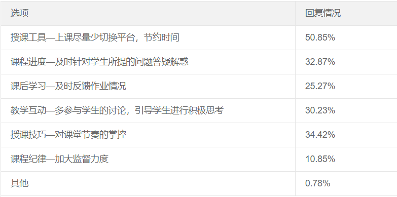 这次疫情带来了学习方式的巨大改变,同学们认为教师还需要改进的方面有:1)授课工具—上课尽量少切换平台,节约时间,2)授课技巧—对课堂节奏的掌控,3)课程进度—及时针对学生所提的问题答疑解惑,4)教学互动—多参与学生的讨论,引导学生进行积极思考,5)课后学习—及时反馈作业情况等。