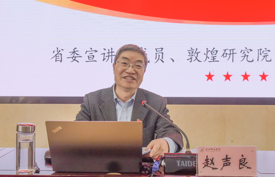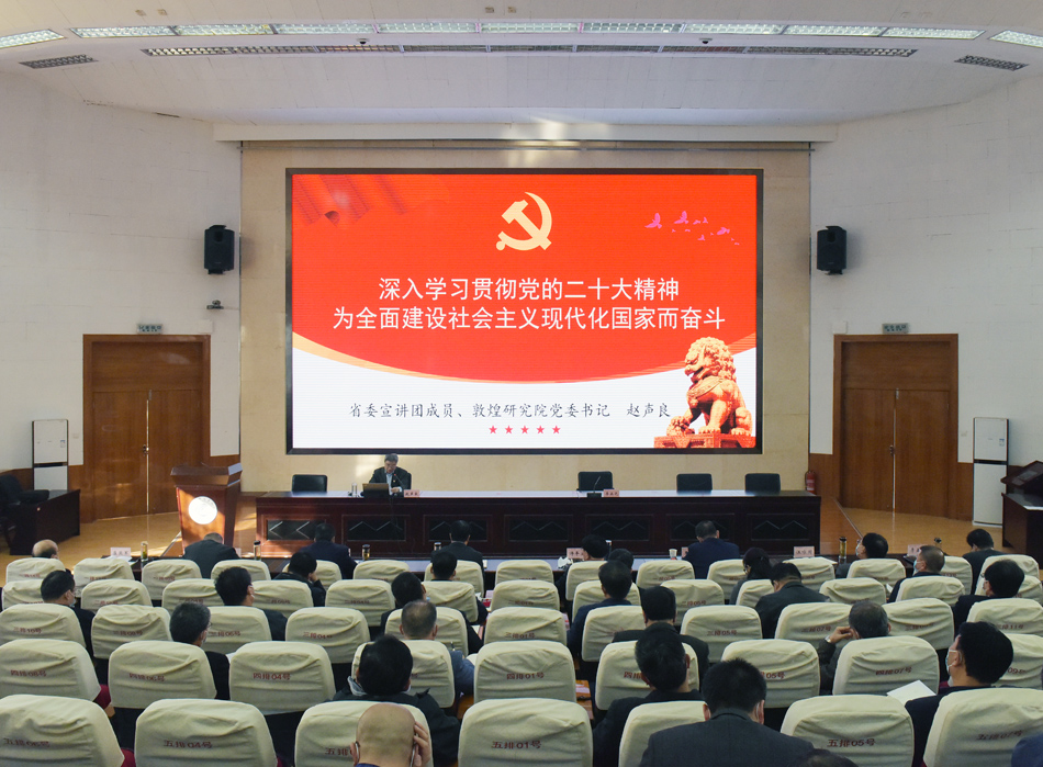 赵声良以“深入学习贯彻党的二十大精神为全面建设社会主义现代化国家而奋斗”为题,聚焦党的二十大的主题和主要成果、过去五年的工作和新时代十年的伟大变革、马克思主义中国化时代化、中国式现代化、全面建设社会主义现代化国家的目标任务、坚持党的全面领导和全面从严治党、应对风险挑战、全面深入学习宣传贯彻党的二十大精神八个方面,对党的二十大精神进行了全面深入系统的解读。
