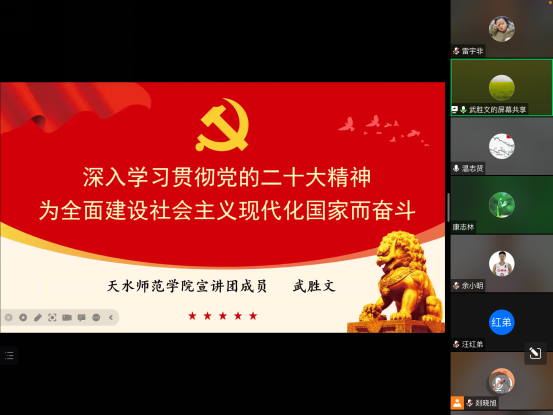 武胜文为师生们解读了党的二十大报告的主要内容,并围绕七个方面详细梳理了党的二十大报告,一是党的二十大主题;二是过去五年的工作和新时代十年的伟大变革;三是开辟马克思主义中国化时代化新境界;四是以中国式现代化全面推进中华民族伟大复兴;五是对党和国家事业的新部署要求;六是加强党的全面领导、坚定不移推进全面从严治党的部署和要求;七是以顽强斗争应对风险挑战的要求。武文胜强调,学习党的二十大精神,要准确把握党的二十大报告的内涵和外延,要坚定马克思主义信仰、坚定理想信念,领会和践行“两个结合”,践行实事求是的科学学风,深入领会习近平新时代中国特色社会主义思想的世界观和方法论,弘扬顽强的斗争精神和勇立潮头开创历史的时代精神,不断谱写新时代中国特色社会主义新篇章。