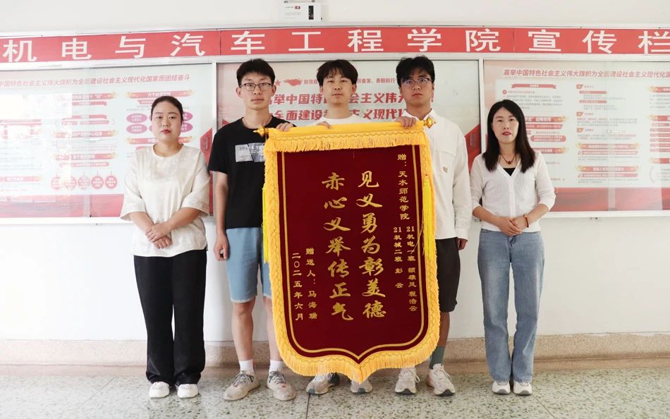 事后,获救儿童的家长经多方打听,才得知是我校2025届的三位应届毕业生,特送来锦旗表达最诚挚的谢意。两位家长激动地表示:“要不是三位同学奋不顾身地跳下去救人,后果将不堪设想。天水师范大学学子在危急关头勇于献身的精神,堪为青年楷模!”